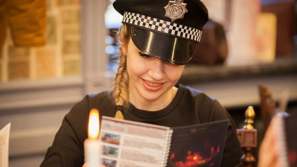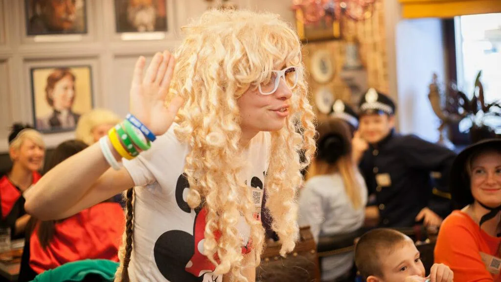 На початку свята ми розсаджуємо гостей за столиками та роздаємо ролі кожному учасникові. Усі команди одночасно грають в один і той самий сюжет. У кожного столика буде свій детектив, свій злочинець, свої підозрювані! Сіль гри - підійти до розгадки ближче за інші команди та набрати найбільше балів за правильні здогадки про розслідування. Детективний поєдинок проходить у дуже запальній атмосфері! У зв’язку з тим, що у грі змагаються команди за столиками, у процес включаються навіть ті гості, які зазвичай «випадають» зі святкової програми.